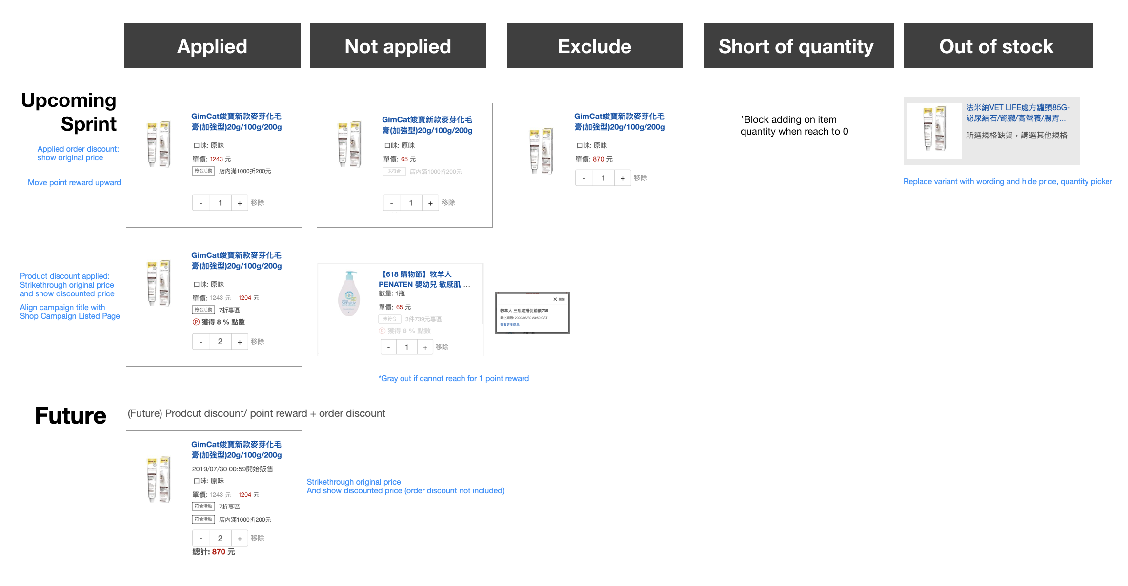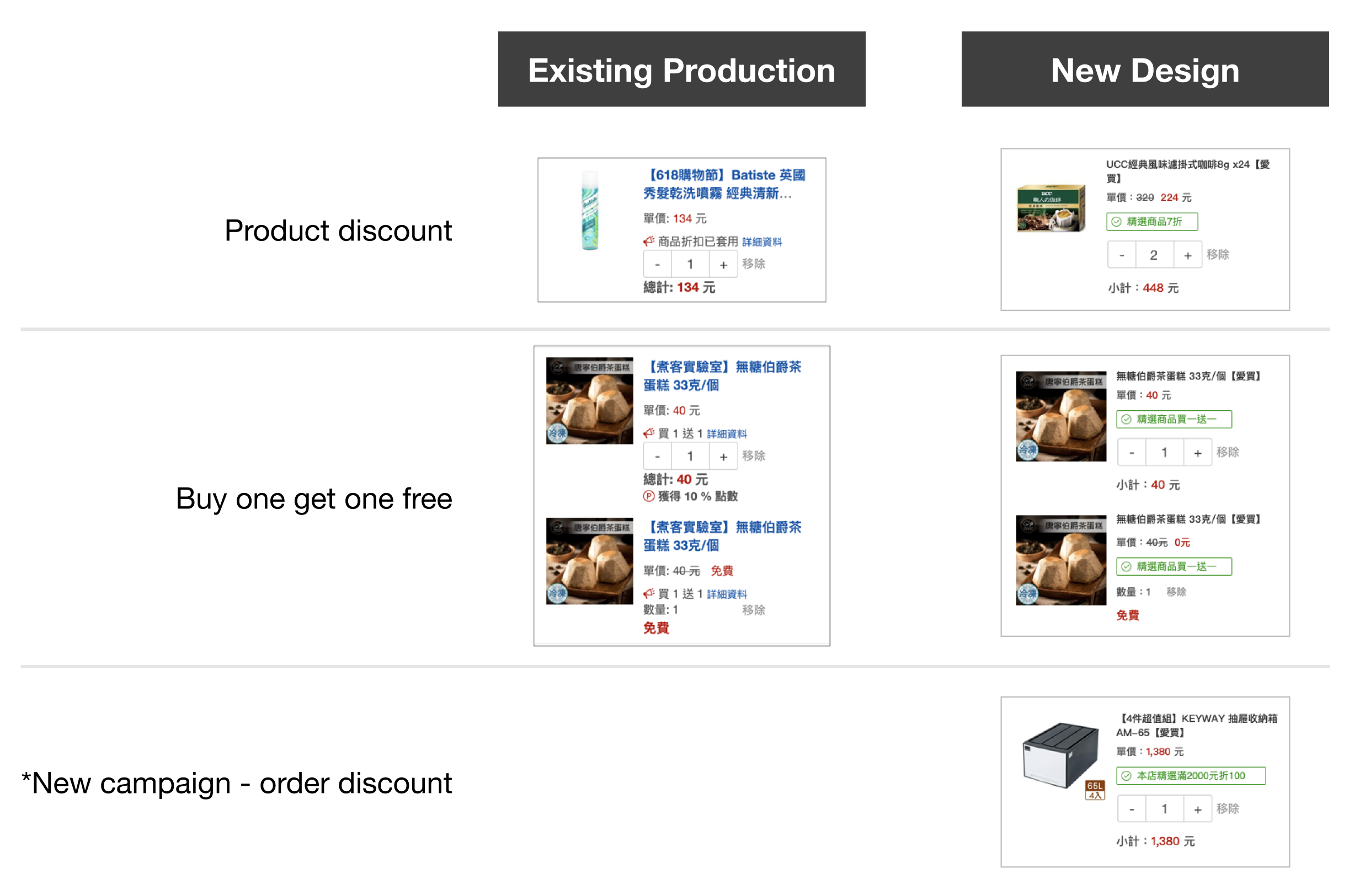 Following the analysis of existing layout and information display on product cards, I illustrated the wireframe for variants of campaign types and status into more synthesis manner. And I created campaign label to solve the user painpoint that hard to scan and identify campaign types on multiple products for a better deal.