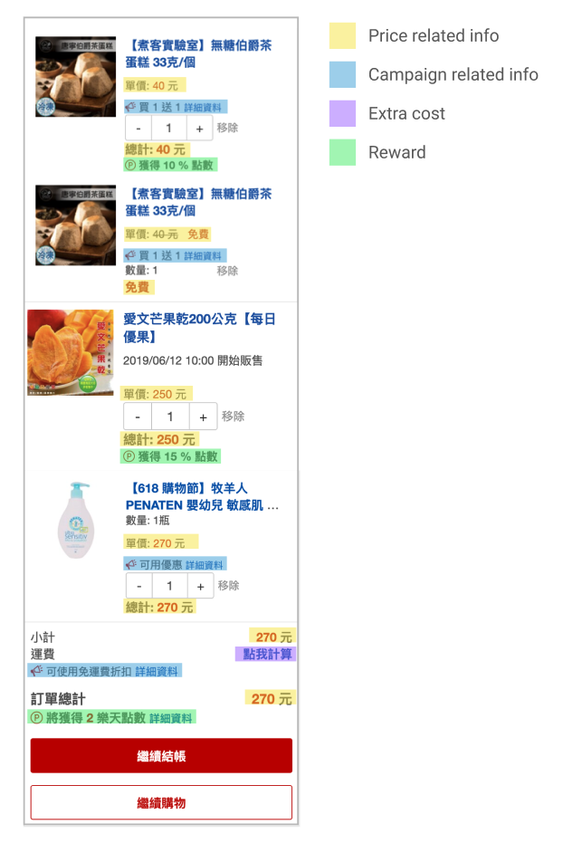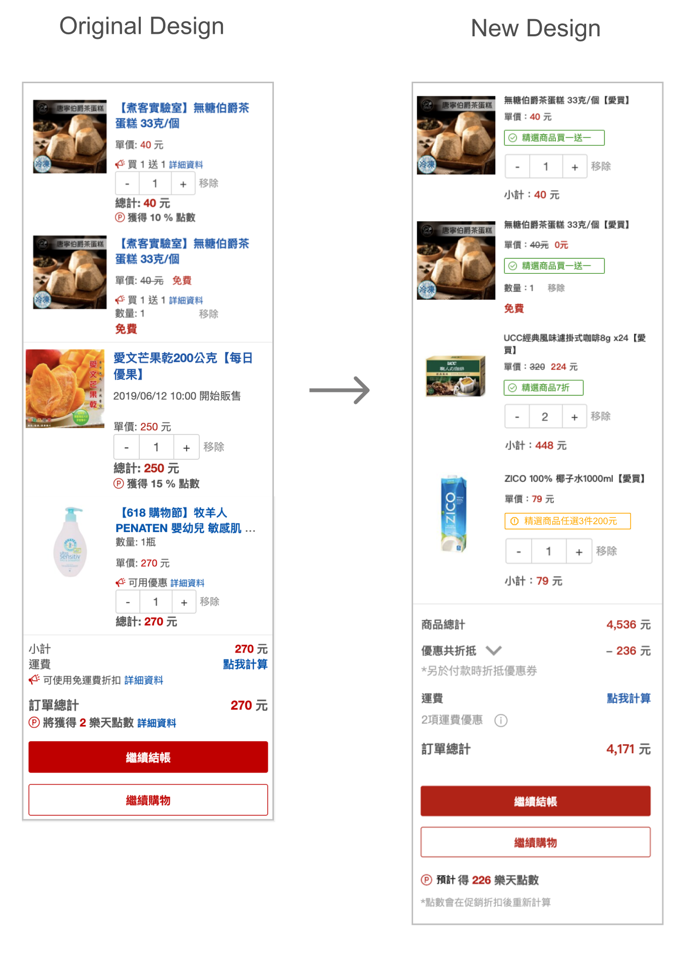 While challenge two required design effort, product and business departments came to consensus on enhancing checkout process to meet the business goal and solve existing user painpoints. The new design of shopping Cart page and Delivery page helped users to check product info, campaign info and summary of each cart in easier manner, reducing the overwhelming information during the original checkout process.