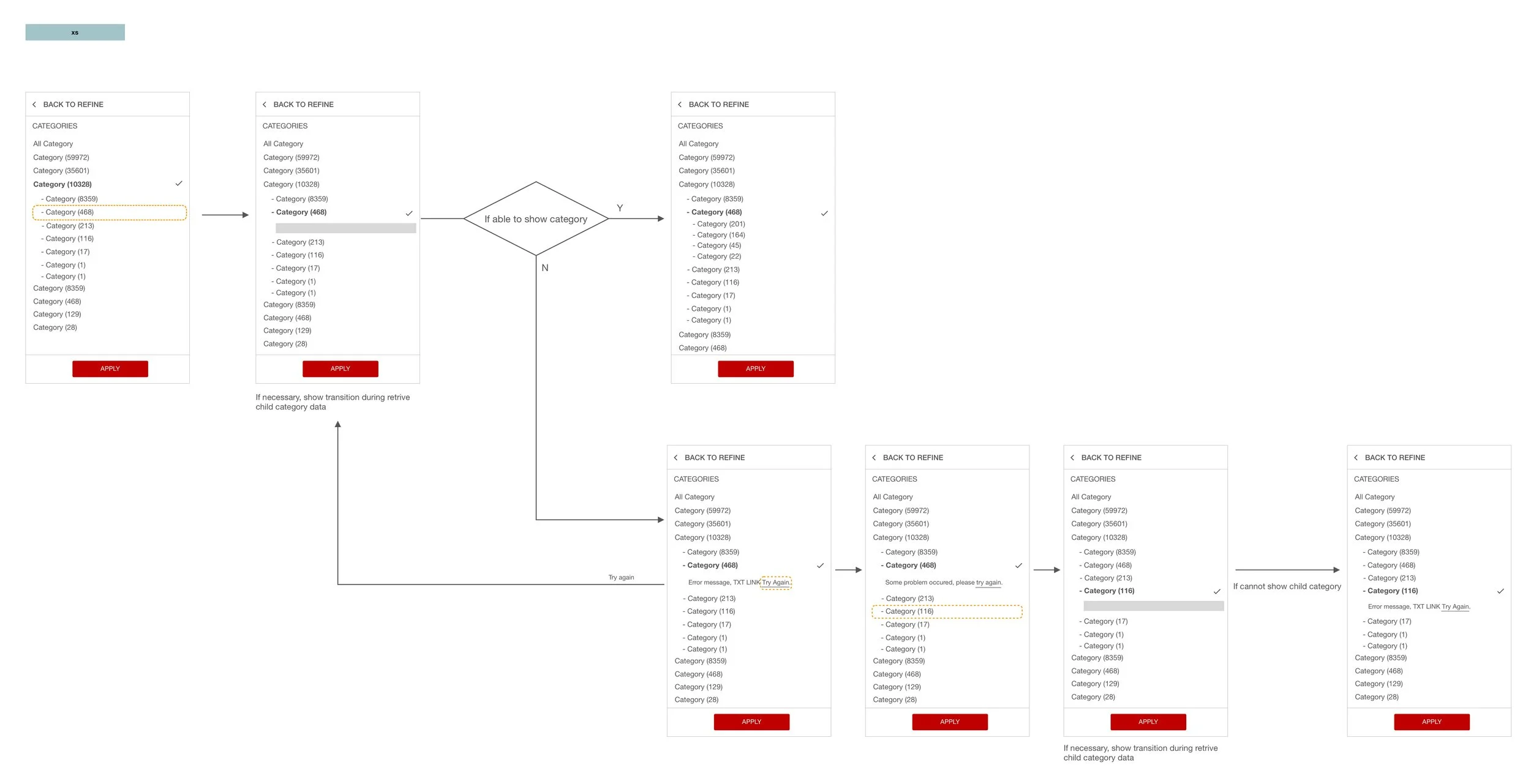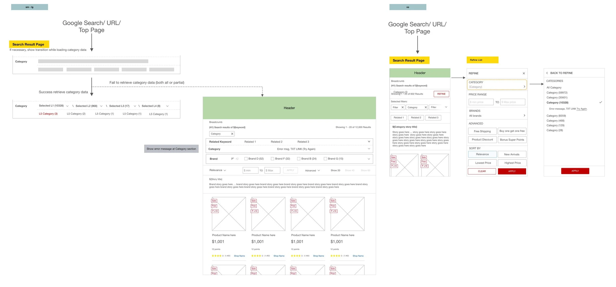 The wireframe and flow show the new category structure and interaction base on the responsive layout