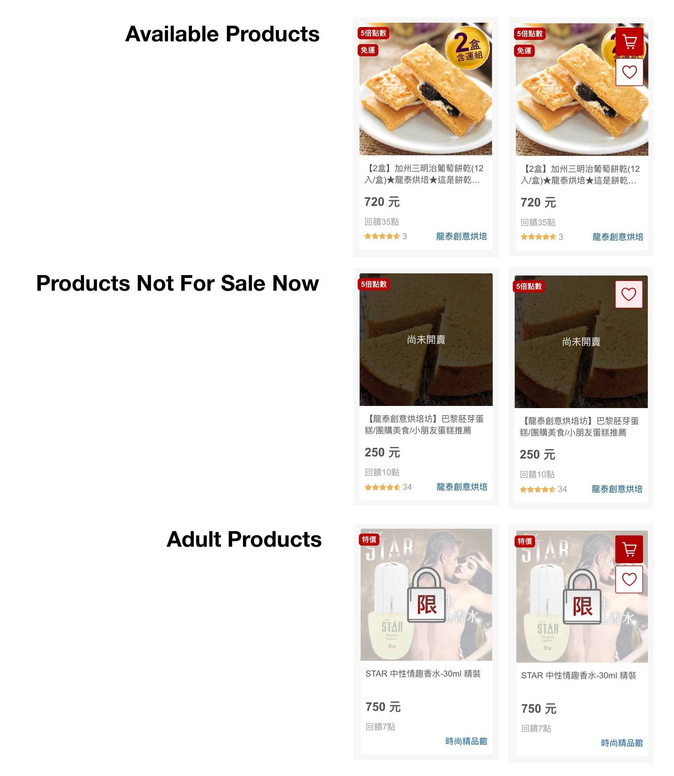 A variants of product cards show the different status of product and hover effect for desktop design