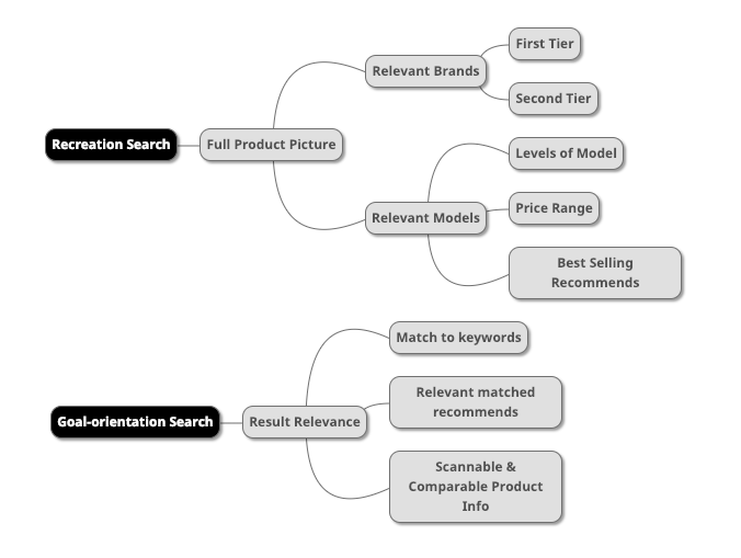 Users scan through product list to check if these results matched what in their mind. And compare between products for a good deal. Depending on preference of recreation or goal-oriented search behavior.