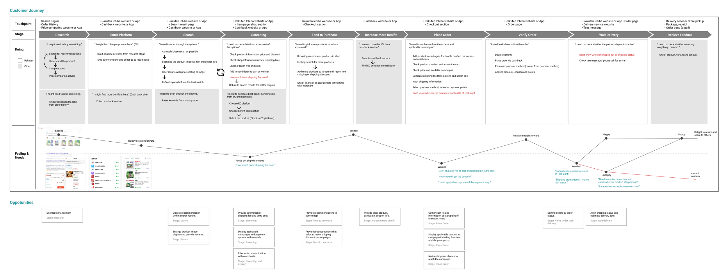 To uncover untapped possibilities for elevating the search page experience, I synthesized insights gathered from user journey and user types. The synthesis consolidated in the creation of a comprehensive customer journey map, providing an overview of the purchase journey at each stage and unveiling prospects for enhancement.