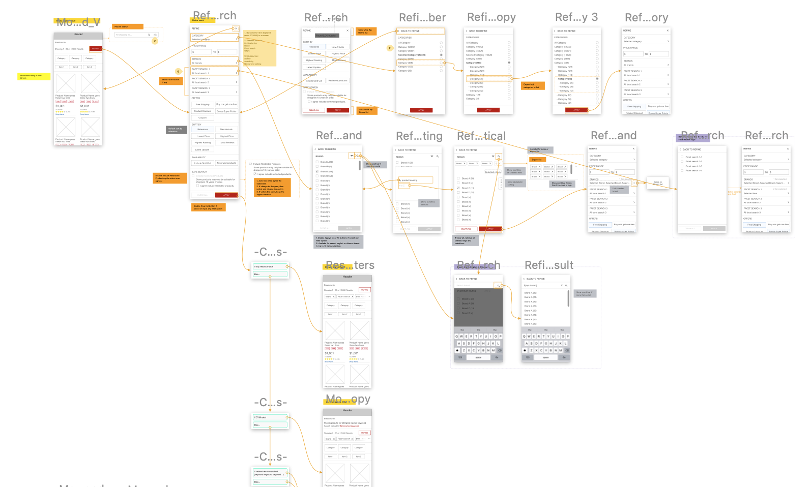 The wireframe and flow of advanced search function on mobile device